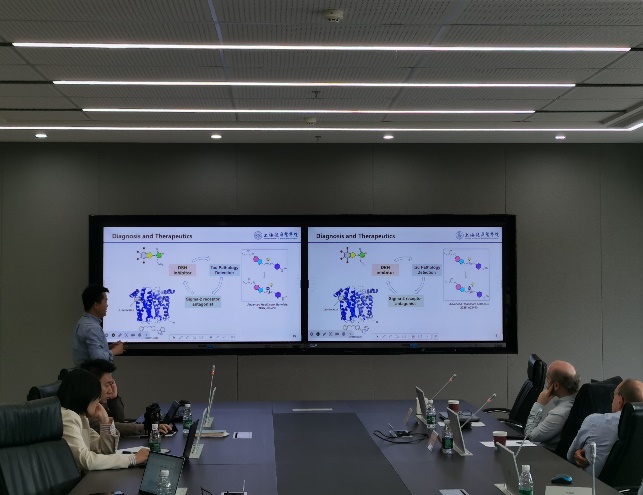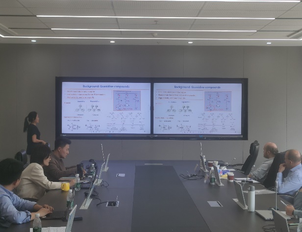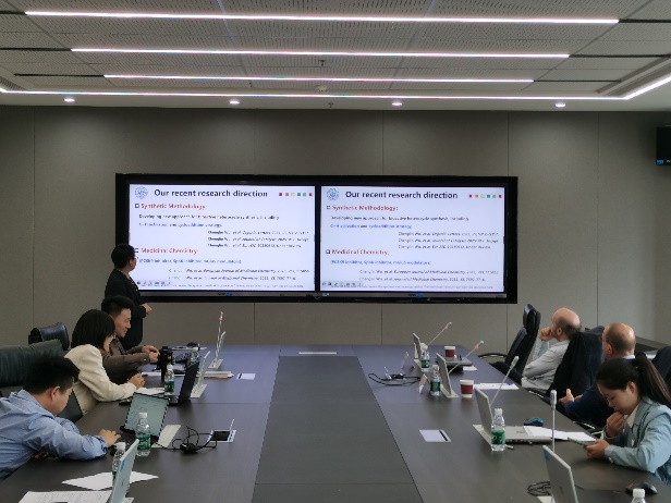 交流会上,来自药物化学、药物分析、无机化学、微生物与生化药学等教研室的9位科研骨干进行了精彩的学术报告。每位汇报人围绕其研究方向进行阐述,现场讨论气氛活跃,思维碰撞激烈。其中,郑兰红副教授分享了课题组在海洋微生物天然产物挖掘方面的最新进展。吴锴副教授汇报了酶分子的计算设计及其在抗癌药拉罗替尼合成中的应用成果。纪万里副教授围绕我国特色中药铁皮石斛中有效成分的分析与鉴定进行研究,研究内容引起法方专家的极大兴趣,双方就石斛的品种与鉴定等进行了深入交流。李晓娜博士报告了发表在化学顶级期刊《德国应用化学》封面的成果,其在复杂糖链的合成上取得的重要突破受到法方专家的高度认可。吴成林和李凯迪博士分别介绍了课题组在C-H活化领域的最新研究进展及在神经退行性疾病药物开发方面的成果,并与法方专家深入交流。张静副教授围绕胍类化合物的化学生物学方向研究进行了系统汇报。来自药物分析教研室的贾冬玲副教授汇报了一种金属修饰的新型纳米材料及其催化性能;张宇博士报告的关于新型抗氧化材料研究成果展示了其促进伤口愈合的良好效果,引发了与会专家的浓厚兴趣。最后,Masurier教授为大家带来了题为《激肽释放酶相关酶抑制剂的开发》(Development of Kallikrein-related peptidases inhibitors)的学术报告,深入浅出地介绍了其在相关领域的最新研究成果,引发了与会青年教师的热烈讨论。